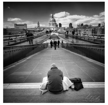Life crossing paths on London’s Millennium Bridge. Commuters push on, while one figure waits in silence, a quiet contrast in a busy city.