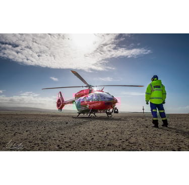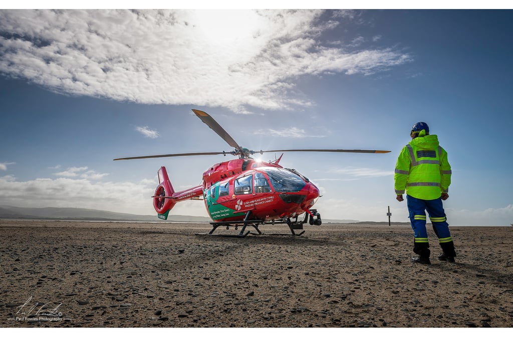 Wales Air Ambulance. Emergency response along the Welsh coast often relies on close coordination between services. This photograph was taken on Aberdyfi beach as the Welsh Air Ambulance from Welshpool landed during a call-out. Standing watch beside the aircraft is a member of the Tywyn Coastguard Rescue Team, ensuring the landing site remains secure while the crew prepares to respond. Partnerships like this play an important role in providing rapid medical assistance to remote communities.
